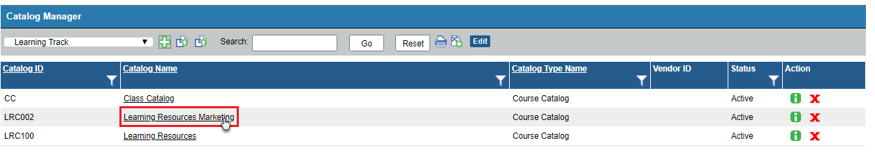 1. To add a Flexi-Group to a Catalog or Learning Track, select CATALOG MANAGER from the Manager menu. Then click on the name of the Catalog or Learning Track, in this example we will select the Course Catalog "Learning Resource Marketing".